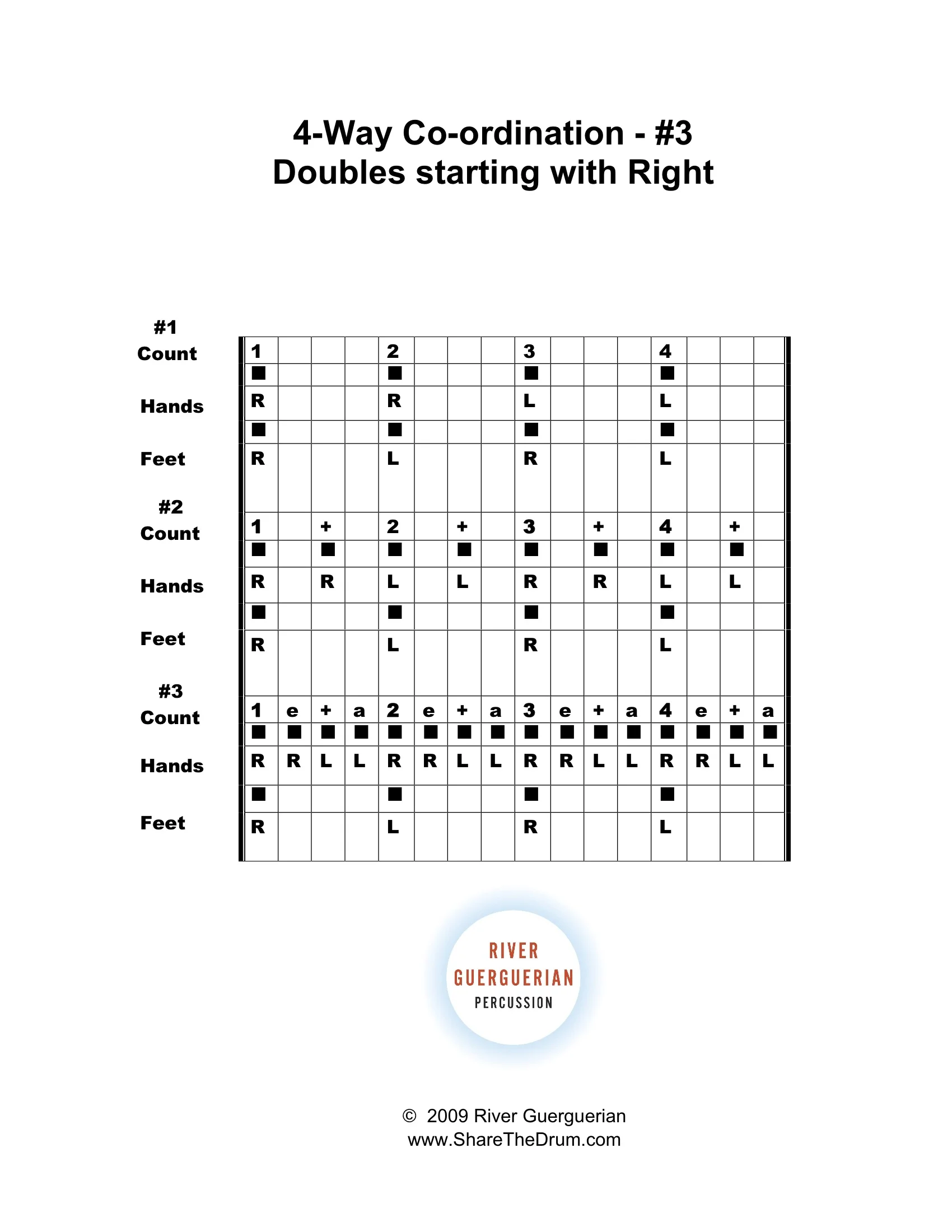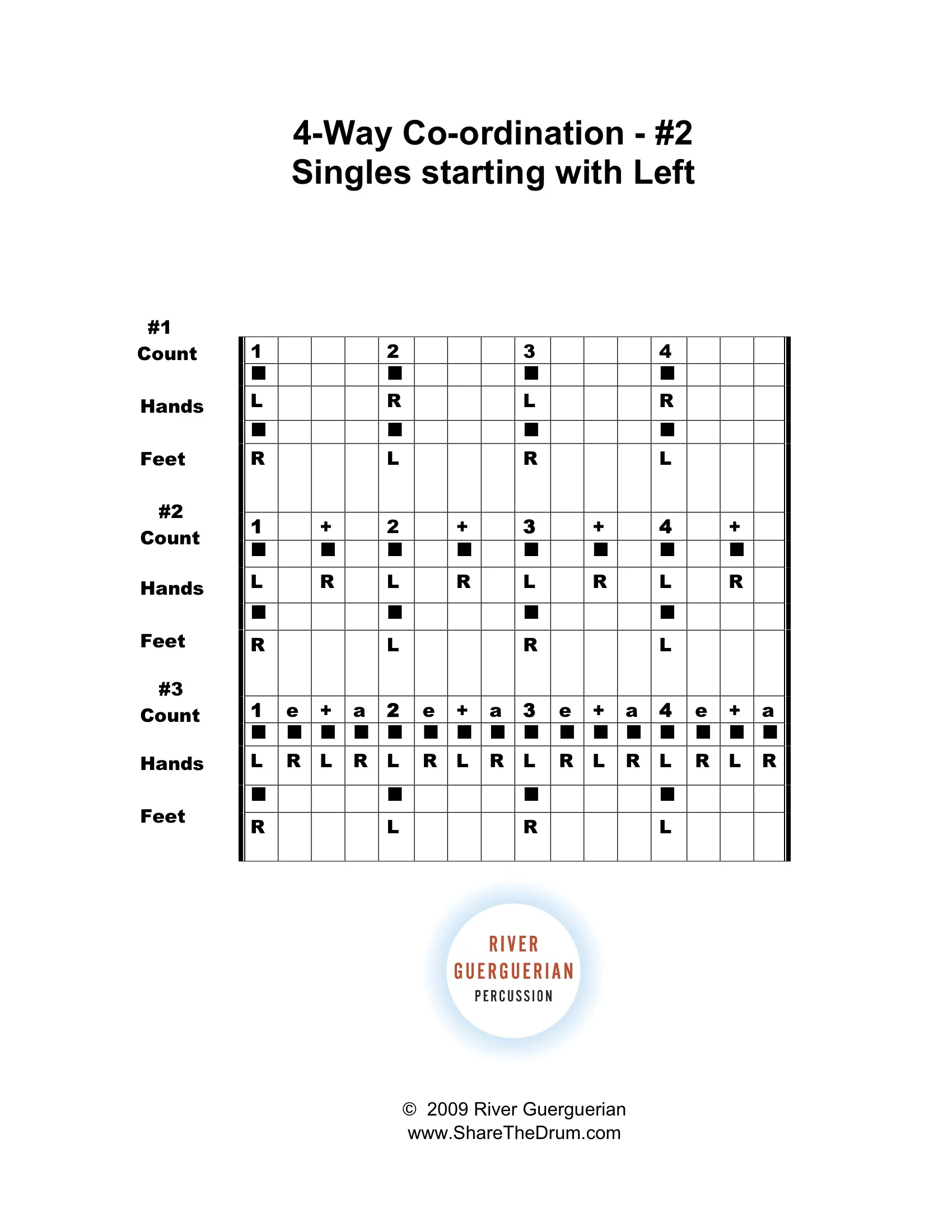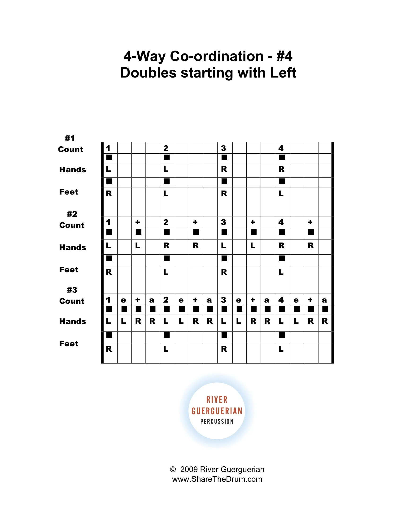 HERE ARE SOME 4-WAY CO-ORDINATION PATTERNS YOU CAN TRY WITH OR WITHOUT A DRUM